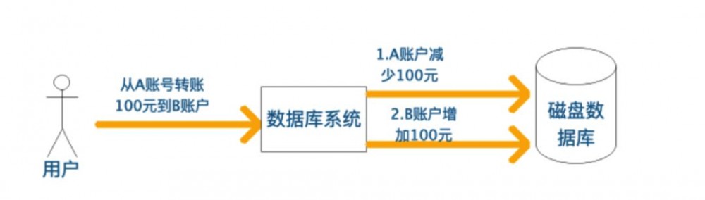 转账是生活中常见的操作,比如从A账户转账100元到B账号。站在用户角度而言,这是一个逻辑上的单一操作,然而在数据库系统中,至少会分成两个步骤来完成: