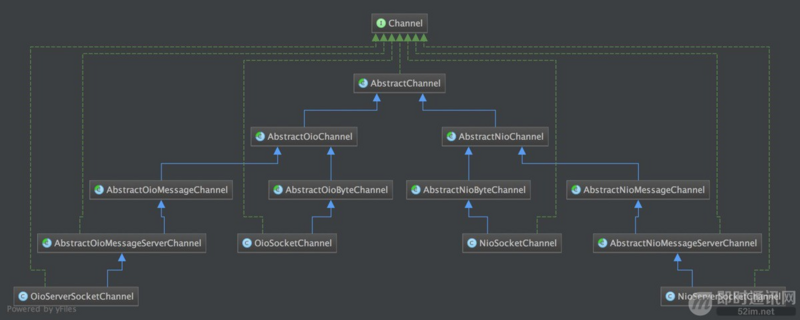 Netty 按照类型逐层设计相应的类. 最底层的为抽象类 AbstractChannel , 再以此根据IO类型、数据传输类型、适用方类型实现. 类图可以一目了然, 如下图所示: