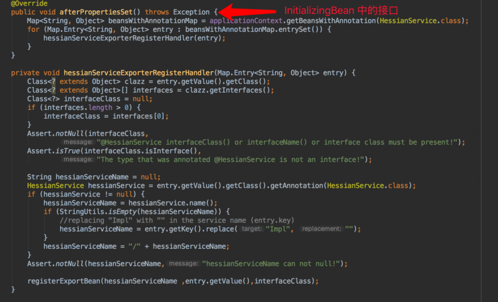 通过实现 InitializingBean , ApplicationContextAware 相应的接口处理 @HessianService 服务暴露