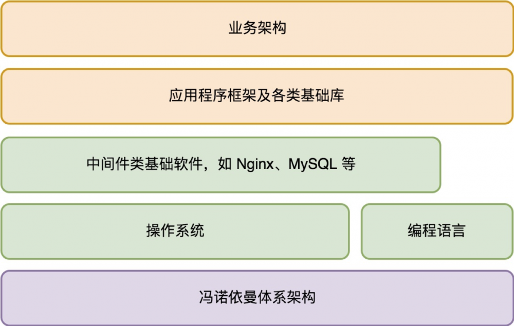 你会发现,今天的我们开发软件的时候,已经处于一些基础的架构设计之中。像冯·诺依曼计算机体系,像操作系统和编程语言,这些都是我们开发一个应用程序所依赖的基础架构。