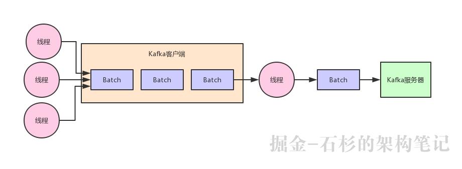 也就是说,消息会先写入一个内存缓冲中,然后直到多条消息组成了一个Batch,才会一次网络通信把Batch发送过去。