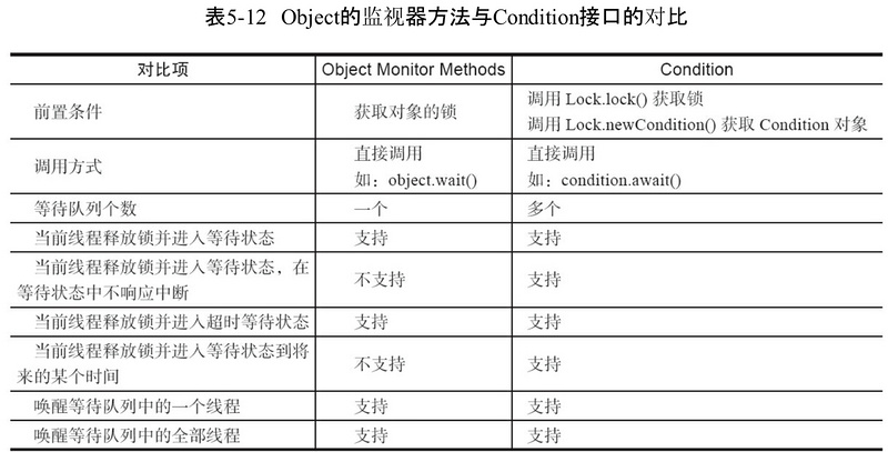 Condition接口也提供了类似于Object的监听器方法、与Lock接口配合可以实现等待/通知模式,但是两者还是有很大区别的,下图是两者的对比