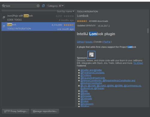 打开IDEA的Setting –> 选择Plugins选项 –> 选择Browse repositories –> 搜索lombok –> 点击安装 –> 安装完成重启IDEA –> 安装成功