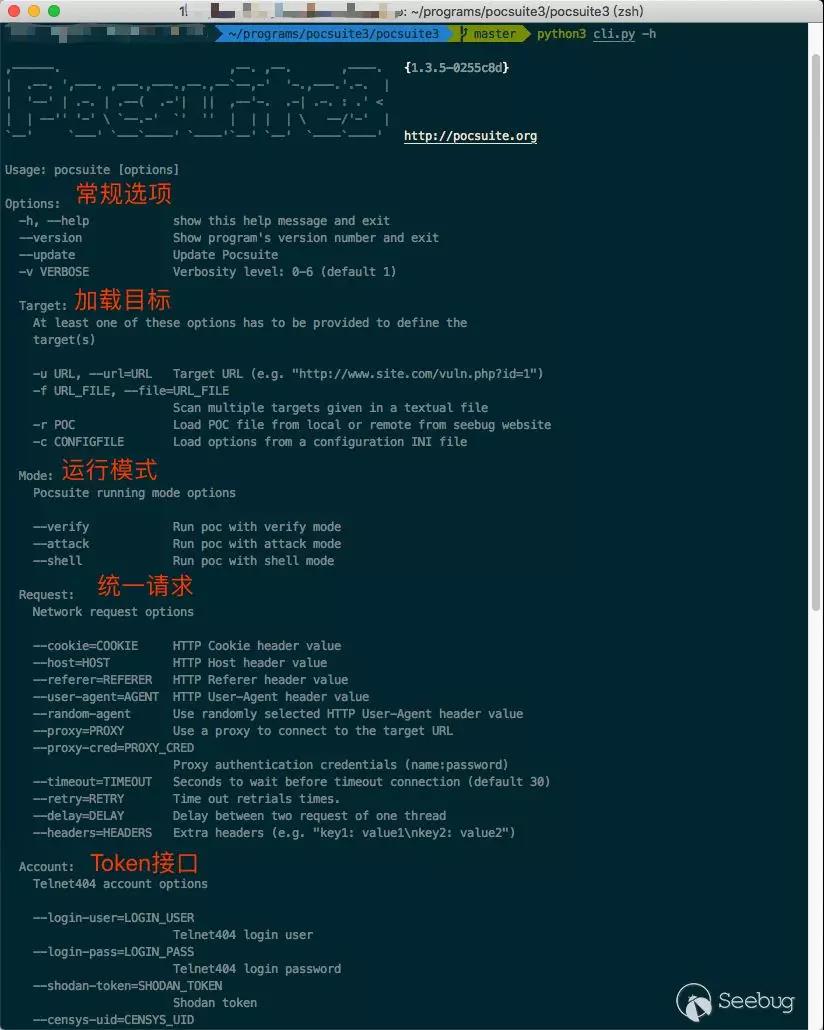 大多数情况,-h可以帮助你了解Pocsuite支持的功能。