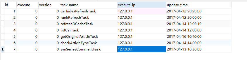 CREATE TABLE `t_schedule_cluster` ( `id` bigint(20) NOT NULL AUTO_INCREMENT COMMENT '@cname:主键', `execute` int(1) NOT NULL COMMENT '@cname:执行状态', `version` int(11) NOT NULL COMMENT '@cname:版本号/r/n ', `task_name` varchar(128) NOT NULL COMMENT '@cname:任务名称/r/n ', `execute_ip` varchar(32) DEFAULT NULL COMMENT '@cname:执行ip/r/n ', `update_time` datetime DEFAULT NULL COMMENT '@cname:修改时间/r/n ', PRIMARY KEY (`id`), KEY `Index_series_id` (`execute`) ) ENGINE=InnoDB AUTO_INCREMENT=8 DEFAULT CHARSET=utf8 COMMENT='@cname:多机定时任务调度'; 复制代码