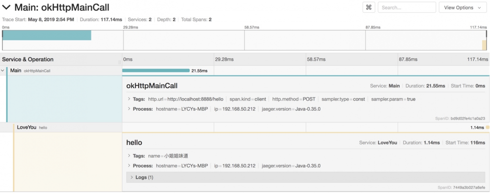 运行Main方法,查看Jaeger的后台,可以看到,我们的分布式Trace已经生成了。