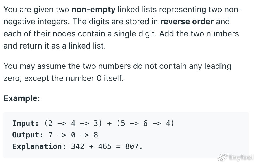 这题的基本意思是,给你两个 非空的 链表表示了两个正整数。每一个节点表示一位数字,按照反序(个位数在最前面)。把两个数字加起来,返回一个代表和的链表。