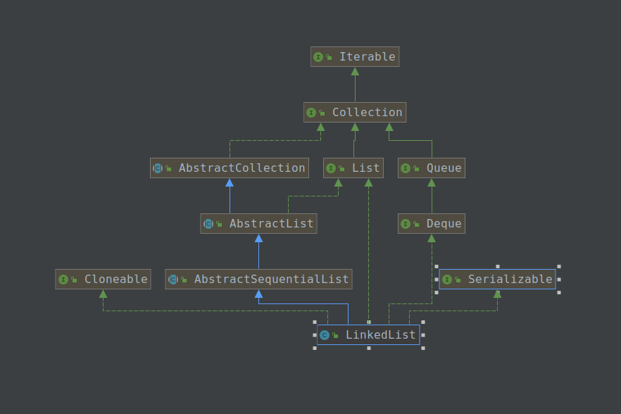 继承了抽象类 AbstractSequentialList ,它提供了一些集合类型无关的基本方法的实现,如 get set add remove 等。通常实现它的集合类型不具备随机访问能力,这和 AbstractList 是相对立的。