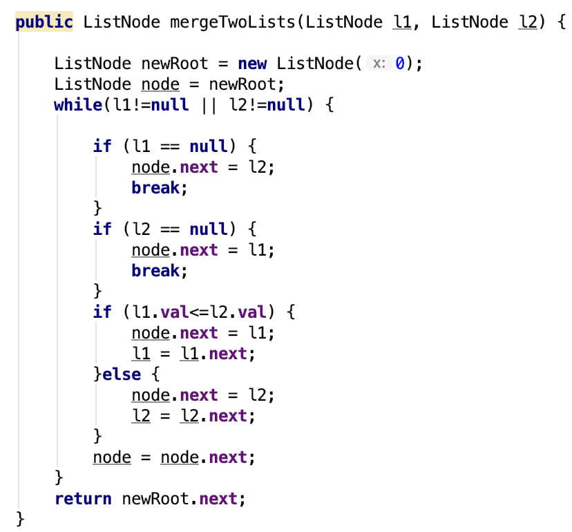 上面思路很直接,但是代码看起来比较复杂,事实上,只要是链表这种结构,我们都可以考虑递归的去解决。思路如下面的代码,用递归来遍历。首先考虑,其中一个链表为空的情况,很简单直接把另一个链表返回。然后,如果l1的第一个节点比l2的第一节点小,或者相等,那么,就l1的第二个节点等于,现有l1的第二个节点和l2的合并结果,然后返回l1。反之亦然。