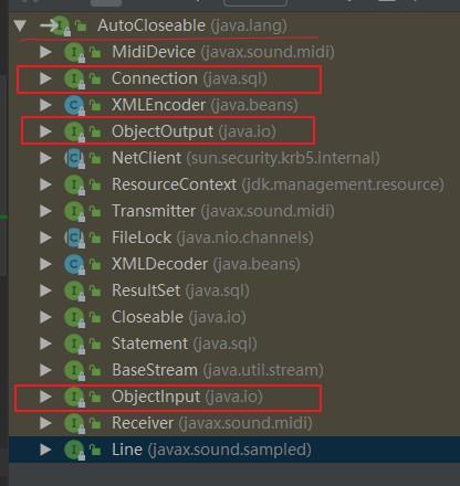 这是因为java7引入了一个AutoCloseable接口。几乎java自带的所有使用到流的都实现了这个接口。下面是继承图。