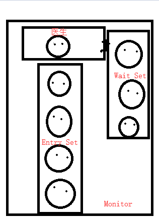 我们可以把监视器理解为一个医院,医院里面只要一个医生,每次只能看一个病人(线程),如果一个病人想看病,他首先要在走廊里面排队(Entry Set),依次进入看病,但是假如某个正在看病的人可能晕血或者血糖低不能暂时继续看病(线程被挂起),这时候不能强行给他看,也不能让后面的病人等他一个,于是就要送他到休息室去休息(Wait Set),休息室里面呆的都是因为各种原因不能继续看病的病人,等休息好了,还可以继续去看病。如下图