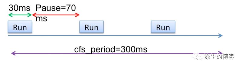 理想情况下,CPU 调度程序会调度应用程序在每个 CFS 周期内稀疏运行,以便应用程序不会长时间暂停。如下图所示,应用程序计划在 300ms CFS 期间运行 3 次。计划运行之间存在应用程序暂停,预期的应用程序暂停时间为 70 毫秒(假设应用程序完全使用 90 毫秒 CPU 配额)。
