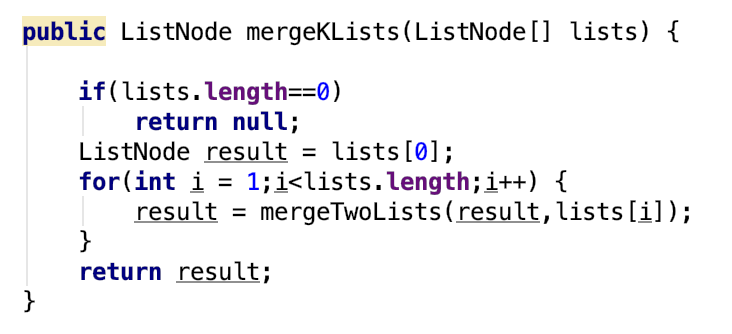 思路很简单一个for循环一个一个链表的去合并。总共需要合并k-1次。代码里面直接调用了 21题的mergeTwoLists方法 :