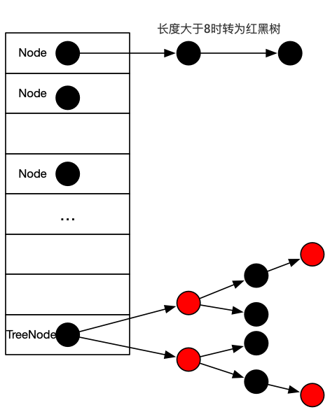 首先分析下为什么会有链表和红黑树。理想情况下,HashMap 中每个 bin 所在位置只有一个节点,这样查询效率最高,为 O(1) 。而拉出一个链表、或者把链表再转为红黑树,是在散列冲突比较严重时的一种应对措施,目的是为了让 HashMap 在极端情况下仍然能够保持较高的效率。