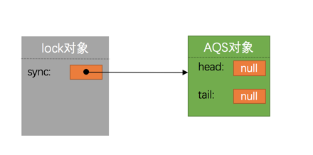 就意味着在内存里创建了一个 ReentrantLock 对象,一个 AQS 对象,在 AQS 对象里维护着 同步队列 的 head 节点和 tail 节点,不过初始状态下由于没有线程去竞争锁,所以 同步队列 是空的,画成图就是这样: