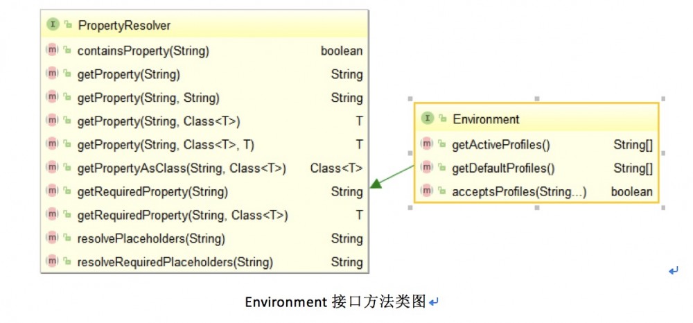Spring 框架从 3.1 版本以后提供了 Environment 接口,包含两个关键概念 profiles 和 properties。Profile 是 Spring 容器中所定义的 Bean 的逻辑组名称,当指定 Profile 激活时,才会将 Profile 中所对应的 Bean 注册到 Spring 容器中,并把相关能力开放给了开发者;而 properties 代表着一组键值对配置信息,其实现中借助了 ConversionService 实现,具备 String 到 Object 的转换能力。其类图如下: