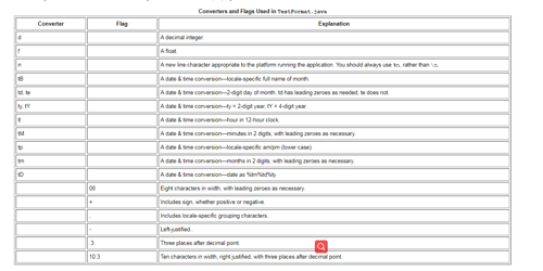 格式说明符以百分号(%)开始,以转换器结束。转换器是一个字符,指示要格式化的参数的类型。在百分号(%)和转换器之间可以有可选的标志和描述符。有许多转换器、标志和描述符,它们都在java.util.Formatter中有说明。