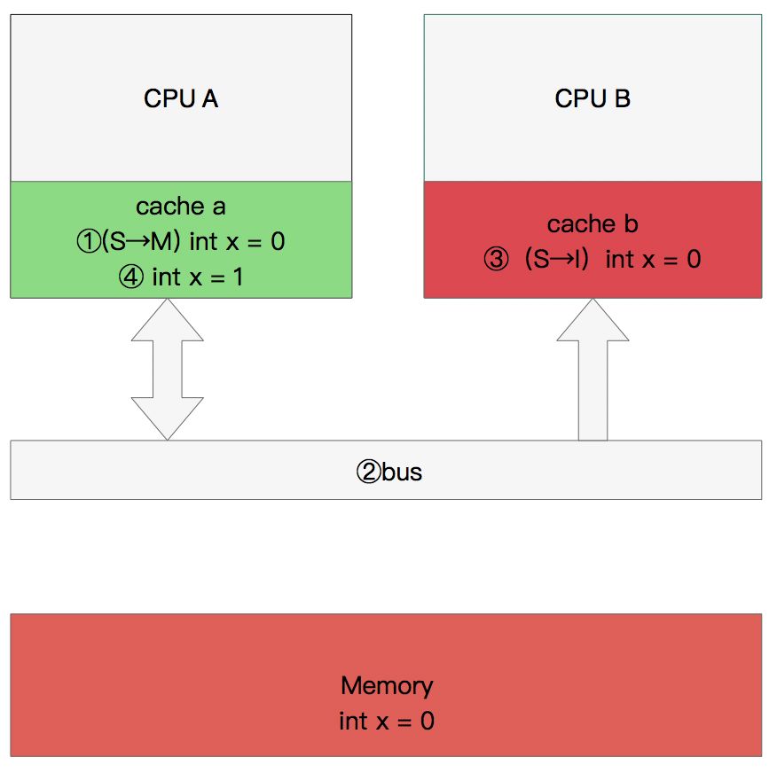 CPU A 将x设置为M状态(修改状态)并通知缓存了x的CPU B, CPU B将本地cache b中的x设置为I状态(无效状态)