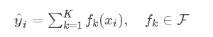 - 6: F是泛函空间,或者叫假设空间;f是函数,或者叫假设。这里的ensemble一共有K个组件/基学习器,他们的组合方式是不带权重的累加。NOTE:【一般boosting里面(如AdaBoost)f是有权重叠加 原因是那些权重自然地被吸收到叶子的weight里面去了。】 by Chen Tianqi