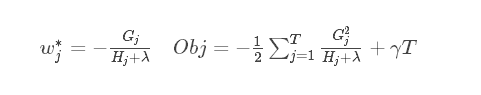 Obj代表了当我们指定一个树的结构的时候,我们在目标上面最多减少多少。我们可以把它叫做结构分数(structure score)。你可以认为这个就是类似吉尼系数一样更加一般的对于树结构进行打分的函数。下面是一个具体的打分函数计算的例子