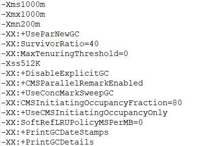 4.使用jstat -gcutil 10086 500 10 (意思是对pid为10086的线程,每500ms显示各分代的内存使用情况), 这里给一下部分jvm的参数设置,如下: