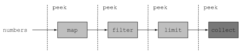 peek 的设计初衷就是在流的每个元素恢复运行之前,插入执行一个动作。