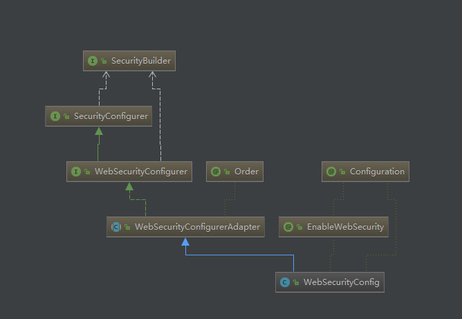 回顾上面我们编写的WebSecurityConfig配置类,也有一个configure方法,那么我们猜测WebSecurityConfig类是不是也实现了SecurityConfigurer接口呢?答案是是的,我们可以看WebSecurityConfig类的类图