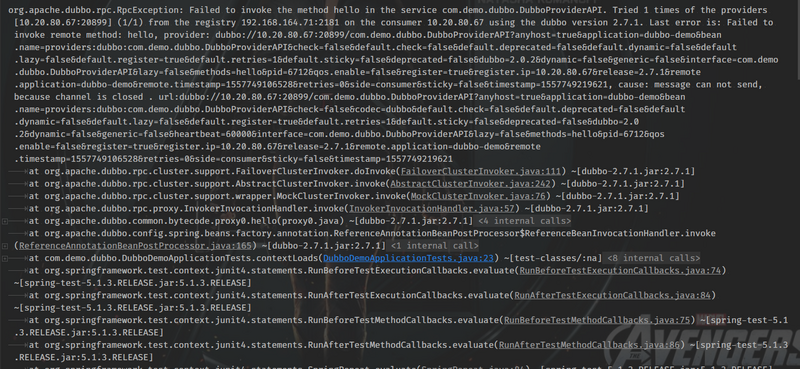 再次查看服务报错的原因,可以看到提供者调用l本地提供 RPC 的服务。由于本地服务已停止,导致调用失败。