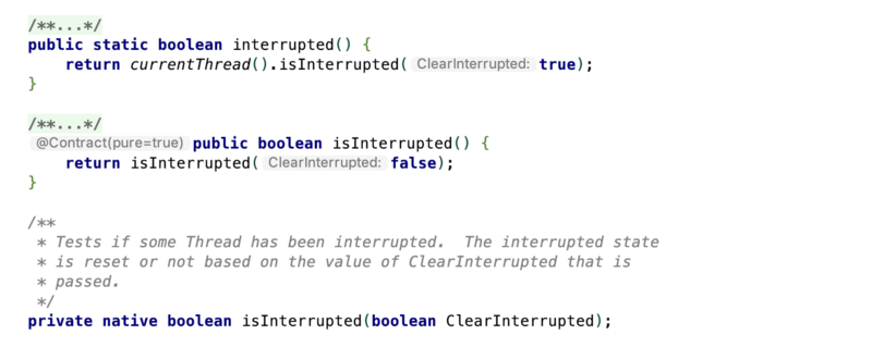 通过观察源码可以看出interrupted方法最后会调用isInterrupted(true)方法,而传入的参数代表是否清除标志位. 可以看到isInterrupted(boolean)是一个本地方法,最终会通过C/C++来执行. 而isInterrupted()最后传入的参数为false,说明不清除标志位.