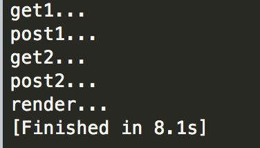 当然,还有更恐怖堆积在一个函数里面。这样的写法的好处就是所有的东西都处于一根线上面,便于大家理解。但是我们设身处地的想一下:如果你是用户,打开网站到看到视图需要这么长的白屏时间,这种体验就大打折扣。此时就需要异步操作了。 看下面一段代码