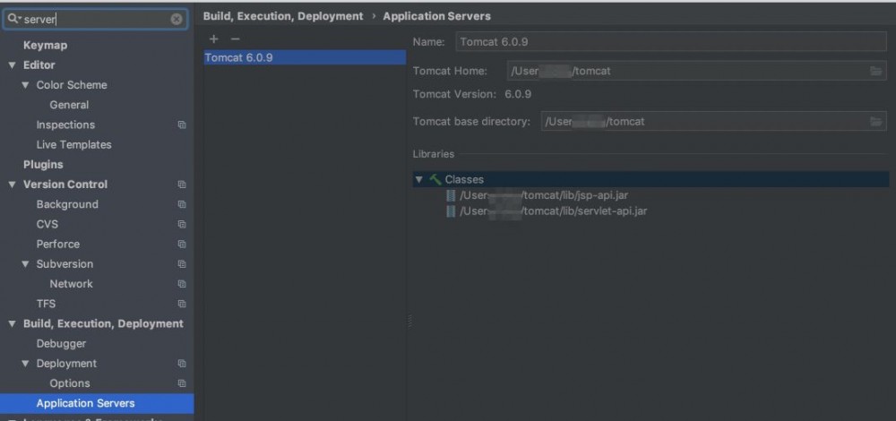 首先在IDE里新建Server环境。从菜单里打开 Preferences ,在左上角的搜索栏输入 server ,找到出现的 Application Servers 栏,点进去之后点击加号进行新建服务器,选择 Tomcat Server ,填入本地目录地址等信息即可。出来时候点击OK保存设置。结果如下: