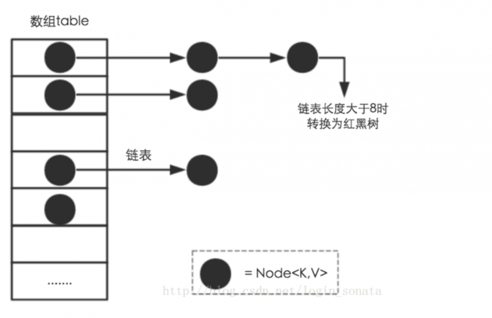 从结构上来讲,使用 数组+链表(红黑树)实现,也即遇到 hash 冲突时使用链表法解决, 如下。