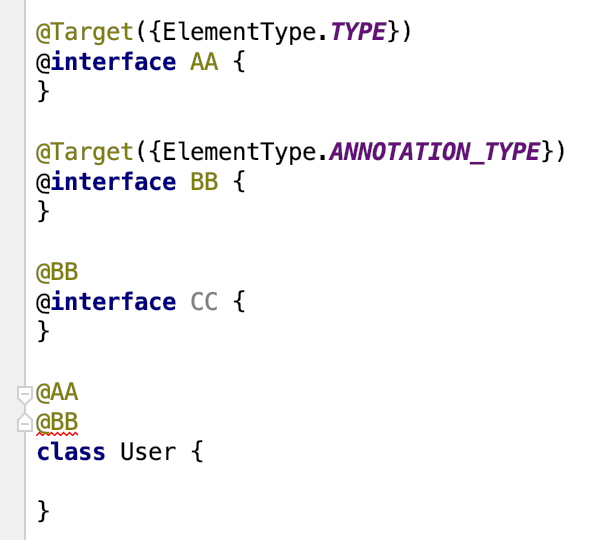 User 类上的 @BB 处报错: '@BB' not applicable to type. 就是说 @Target 为 ElementType.ANNOTATION_TYPE 的注解只能用于其他注解上,而 @Target 为 ElementType.TYPE 可以用在许多地方,类,接口,枚举或其他注解上。除此之外,ElementType.ANNOTATION_TYPE 也没别的太多意思,它与下面的组合注解没有什么关系。