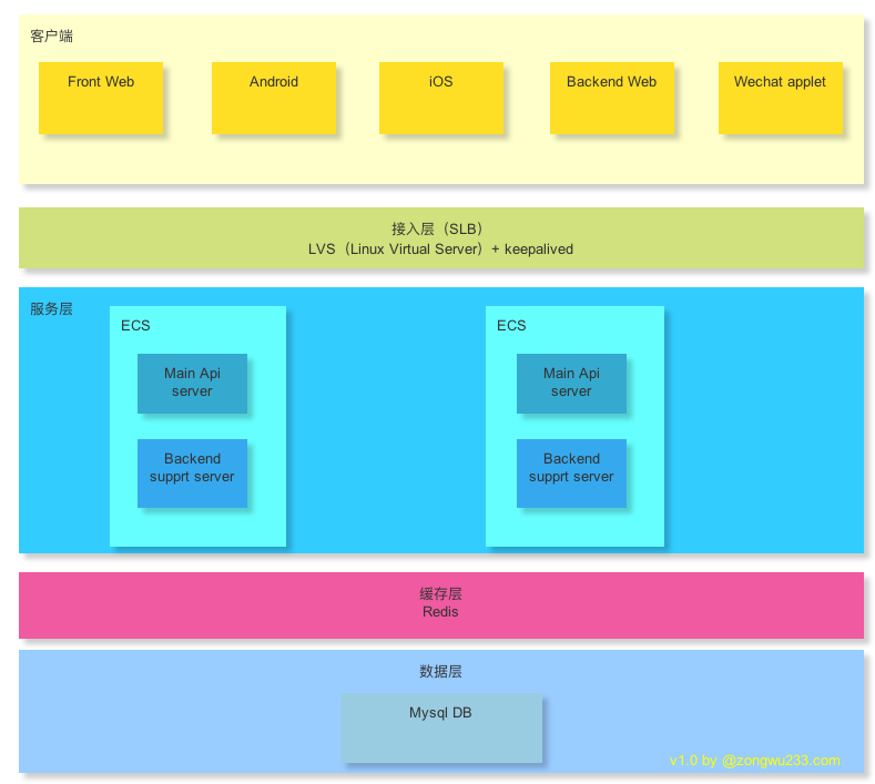 服务层:实际上是使用两台阿里云ECS部署Main Api server 和support server 两个应用。Main Api server 提供App需要的API接口。support server提供运营管理后台页面需要的API接口。