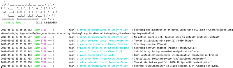 由于我们的工程继承了spring-boot-starter-parent的POM配置,它提供了启动spring-boot应用的相关插件(该插件的run目标用于启动应用),可以通过执行 mvn spring-boot:run 命令启动应用,得到如下运行结果。