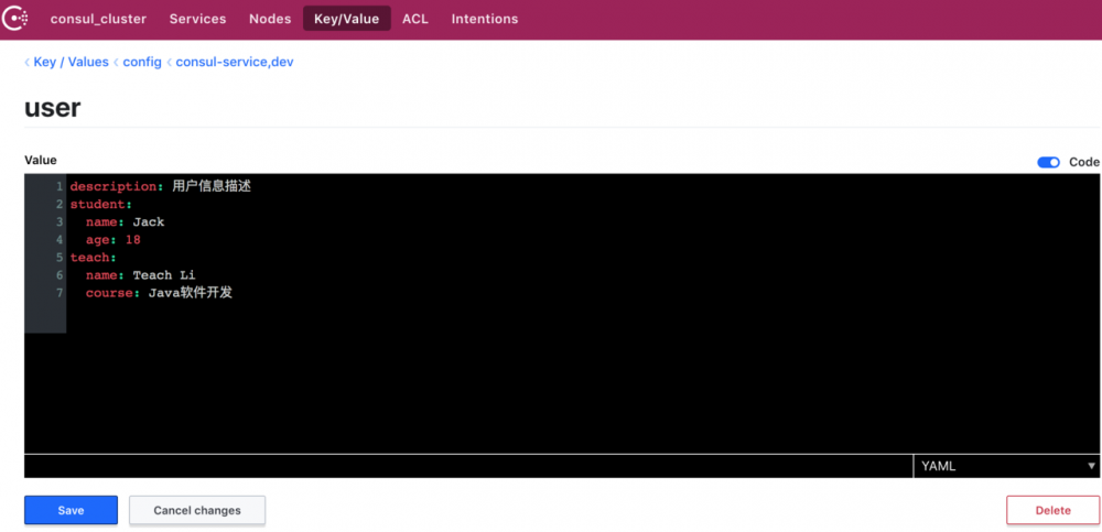 config :为配置基本文件,这里默认为 config 。 consul-service :为 application.yml 中配置的 spring.application.name 值。 dev :为 application.yml 中配置的 spring.profiles.active 值,也是本程序设置环境变量意为开发环境。 user.yml :为配置的文件名,格式为 yml 格式。 config/consul-service.dev/user.yml 复制代码