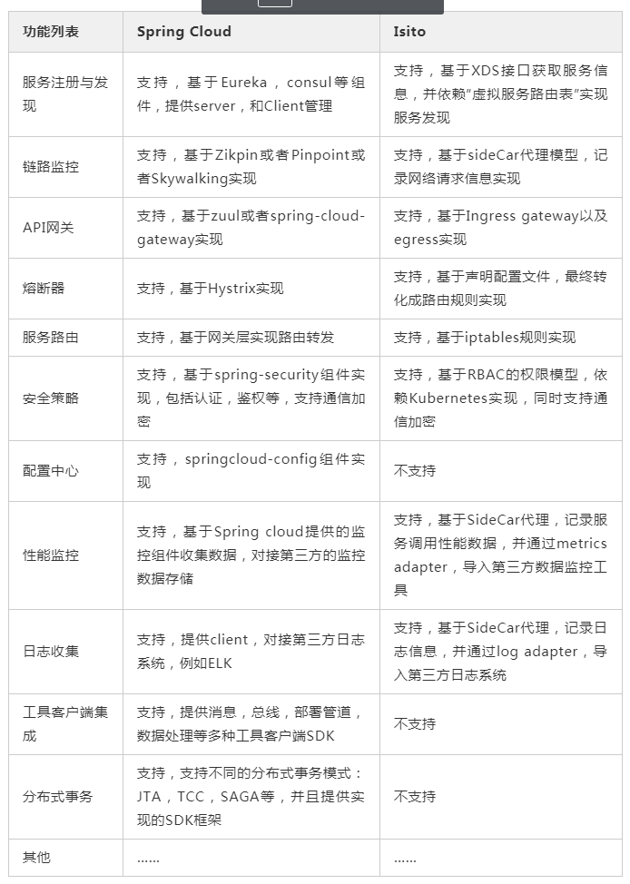 从上面表格中可以看到,如果从功能层面考虑,Spring Cloud与Service Mesh在服务治理场景下,有相当大量的重叠功能,从这个层面而言,为Spring Cloud向Service Mesh迁移提供了一种潜在的可能性。