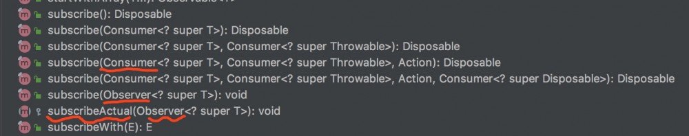 一些熟悉RxJava的朋友可能会说,有时候我们通过 subscribe(...) 订阅的并不是Observer对象,而是consumer对象,有各种重载。如下: