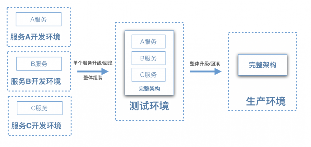面对复杂的微服务架构,微服务组件可能几十个,服务之间存在业务依赖;微服务的版本管理复杂;开发测试流程低效,针对以上问题,单个微服务管理的模式已经不适用,需要考虑微服务架构整体管理。这次的更新能实现复杂微服务架构的整体版本,微服务独立开发,测试环境和生产环境整体升级和回滚,升级的过程只更新变化的服务和配置,过程滚动更新,实现业务不间断升级。