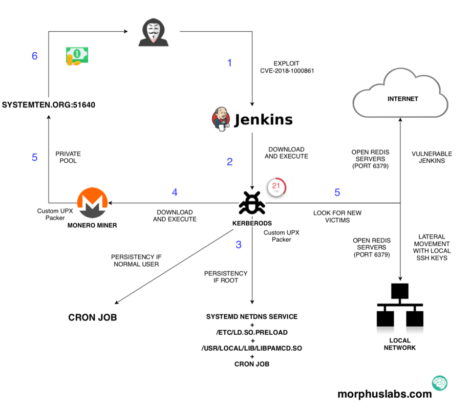 研究人员发现攻击者利用2018年泄露的Jenkins (CVE-2018-1000861)漏洞来使用Kerberods释放器来传播加密货币挖矿机。