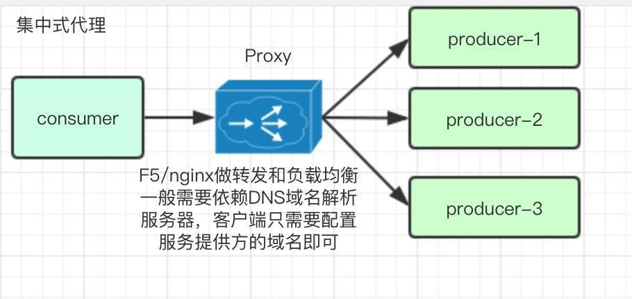 集中代理模式一般是在服务调用方和服务提供方之间部署一套独立的代理系统来接收调用方的请求,然后配合域名系统和特定的负载均衡策略以及路由算法,转发到对应的服务提供方,这个代理系统一般由硬件F5设备加7层软件负载nginx配合域名系统来使用,这种模式,有集中治理,运维简单,而且和语言栈无关的优点,但是目前这个代理系统存在单点问题,而且配置比较麻烦,由于服务调用者没有之间调用服务提供方,所以网络上存在多一跳的开销,目前国内主要有携程等公司在使用