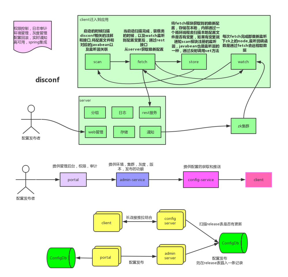 disconf提供一个客户端程序集成在应用程序内方便应用去远程获取配置,并监听配置的变化,服务端提供配置的新增和修改,并给客户端提供获取配置的api