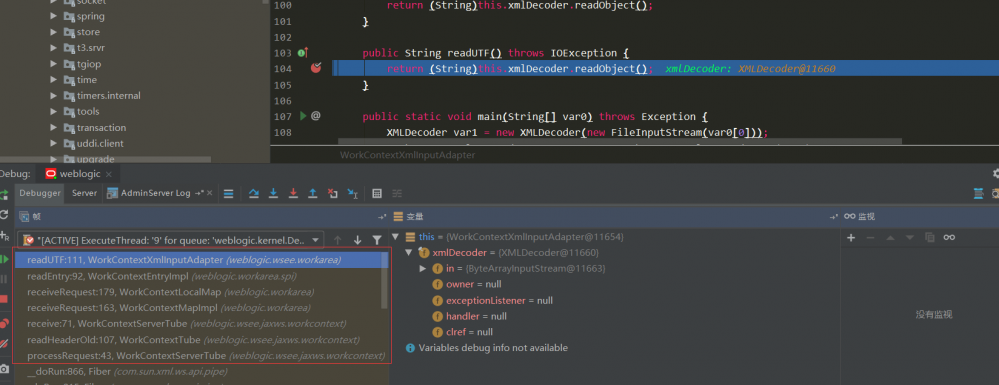 断点打在 weblogic.wsee.workarea WorkContextXmlInputAdapter 的 readUTF() ,可以看到对应调用的堆栈信息