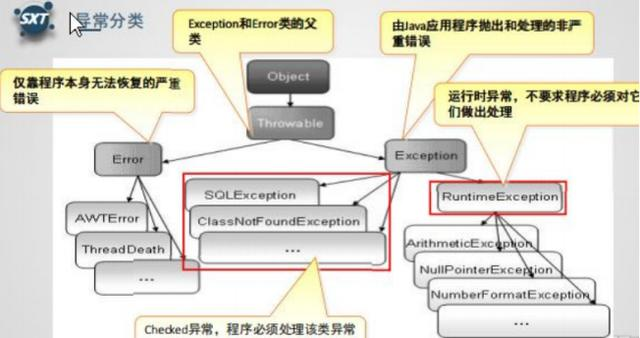 因此,程序员应该关注Exception为父类的分支下的各种异常类。