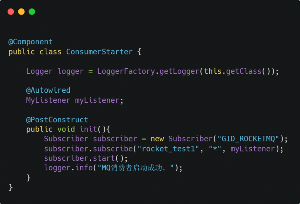 经过回溯代码,发现订阅的逻辑是这样的。将 ConsumerStarter 类注册到Spring,并通过 PostConstruct 注解触发初始化方法,完成MQ消费者的创建和订阅。