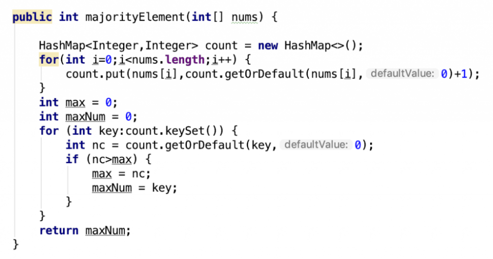 这个思路很简单,就是用hashmap来保存对元素的统计信息。第一遍循环统计每个元素的出现次数。第二个循环找到出现最频繁的元素,即为结果。事实上这个代码可以轻松地改为hashmap一遍循环,能稍微快一点点,但是没有啥复杂度级别的提升,我就懒得改了。