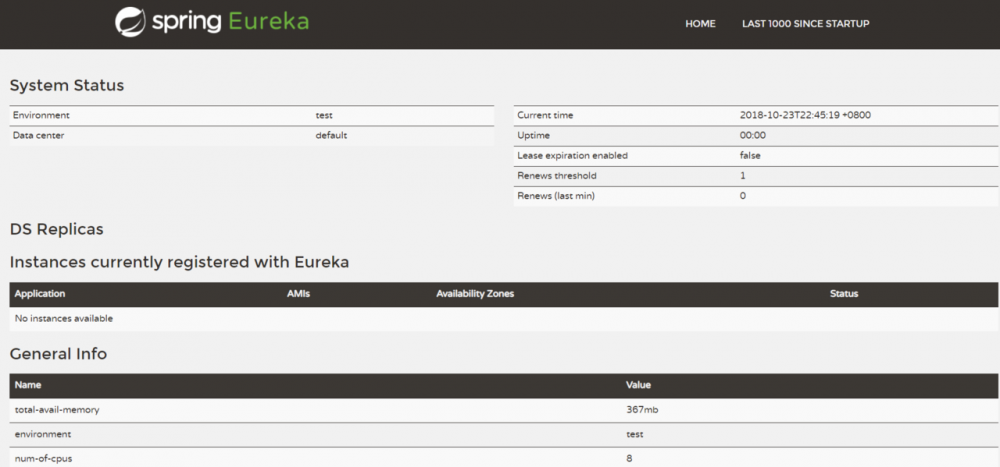 为了与后续要进行注册的服务区分,这里将服务注册中心的端口通过server.port属性设置为1001。启动工程后,访问: http://localhost:1001/ ,可以看到下面的页面,其中还没有发现任何服务。