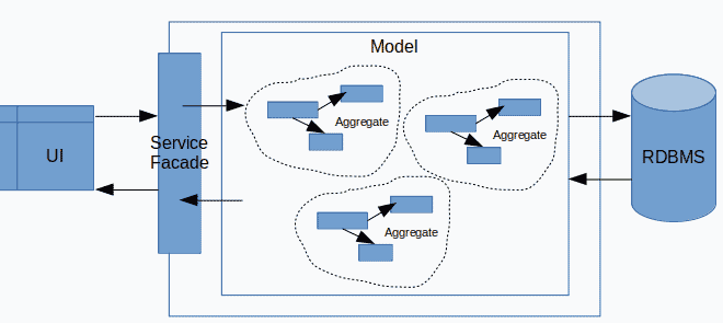 UI(通过控制器层)使用服务外观层,该层负责协调域模型执行的业务操作。模型存储在关系数据库中。在我们的示例中,有 PolicyService 类( Java , C# ),它负责处理与策略相关的所有业务方法。
