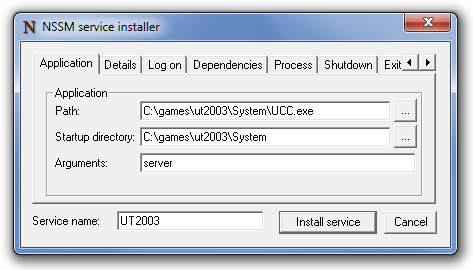 nssm install {服务名称} ,即注册服务的名称。注册服务弹出如下NSSM界面。