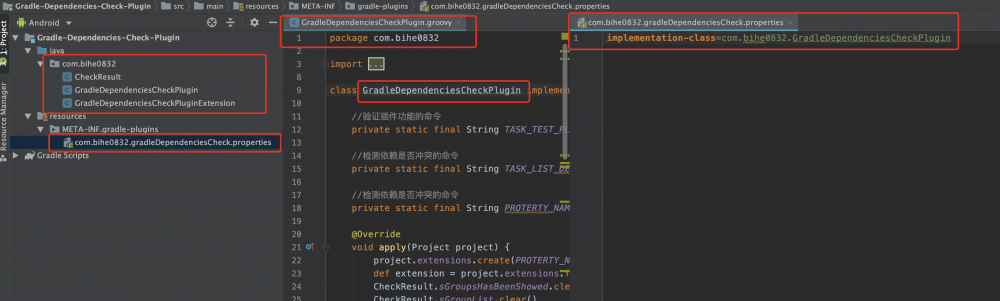 gradle-plugins目录中的文件夹的名称,以及配置中的implementation-class与代码文件的名称都有对应关系,如下图